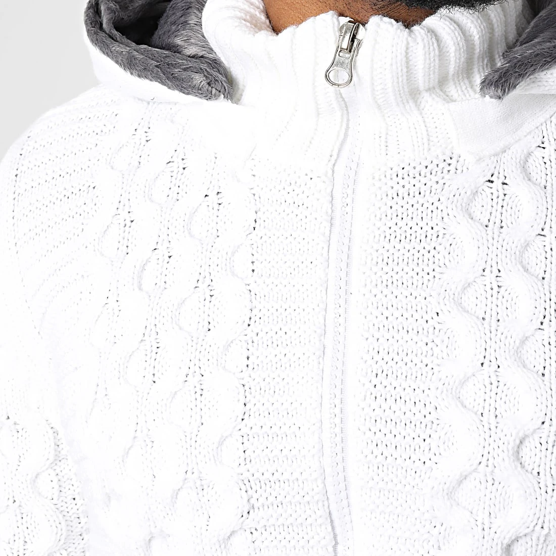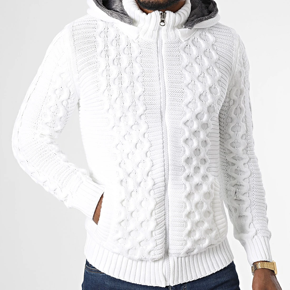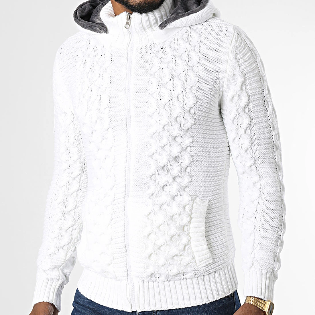 • Gilet capuche confortable essentiel tendance avec motif en maille tressée à l’avant