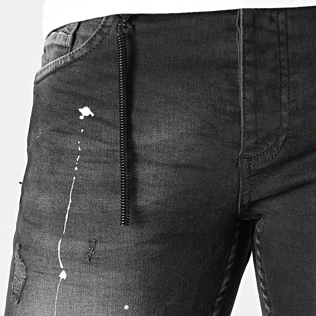 • Jean tendance finition tachée, usée et délavée avec rapiéçages