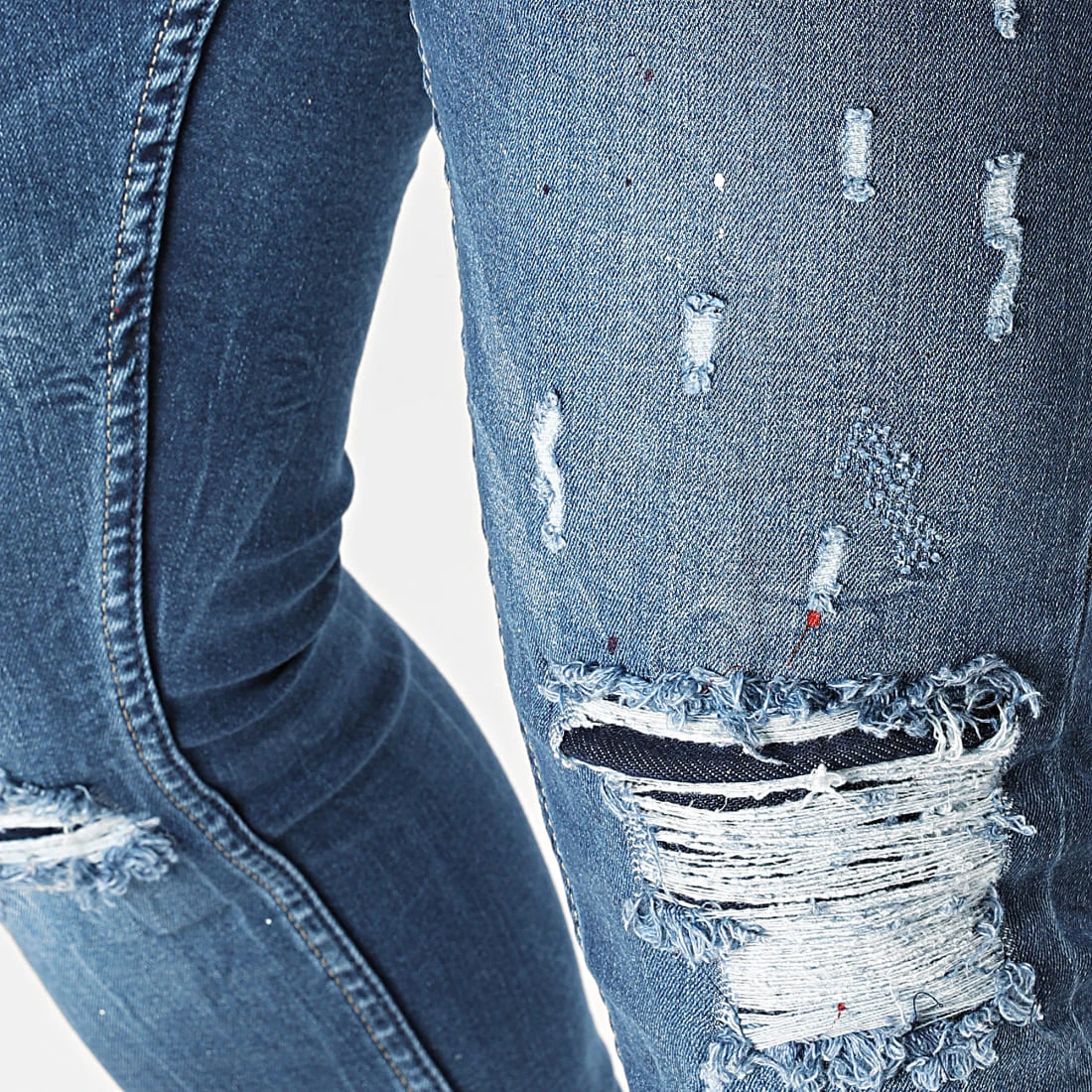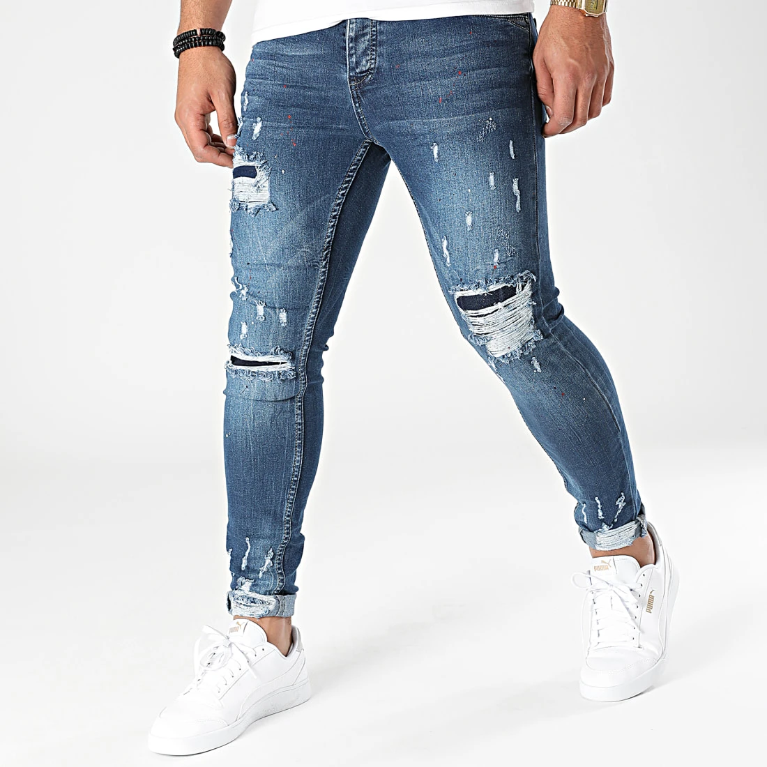 • Jean skinny à finition délavée, usée et tachée avec rapiéçages