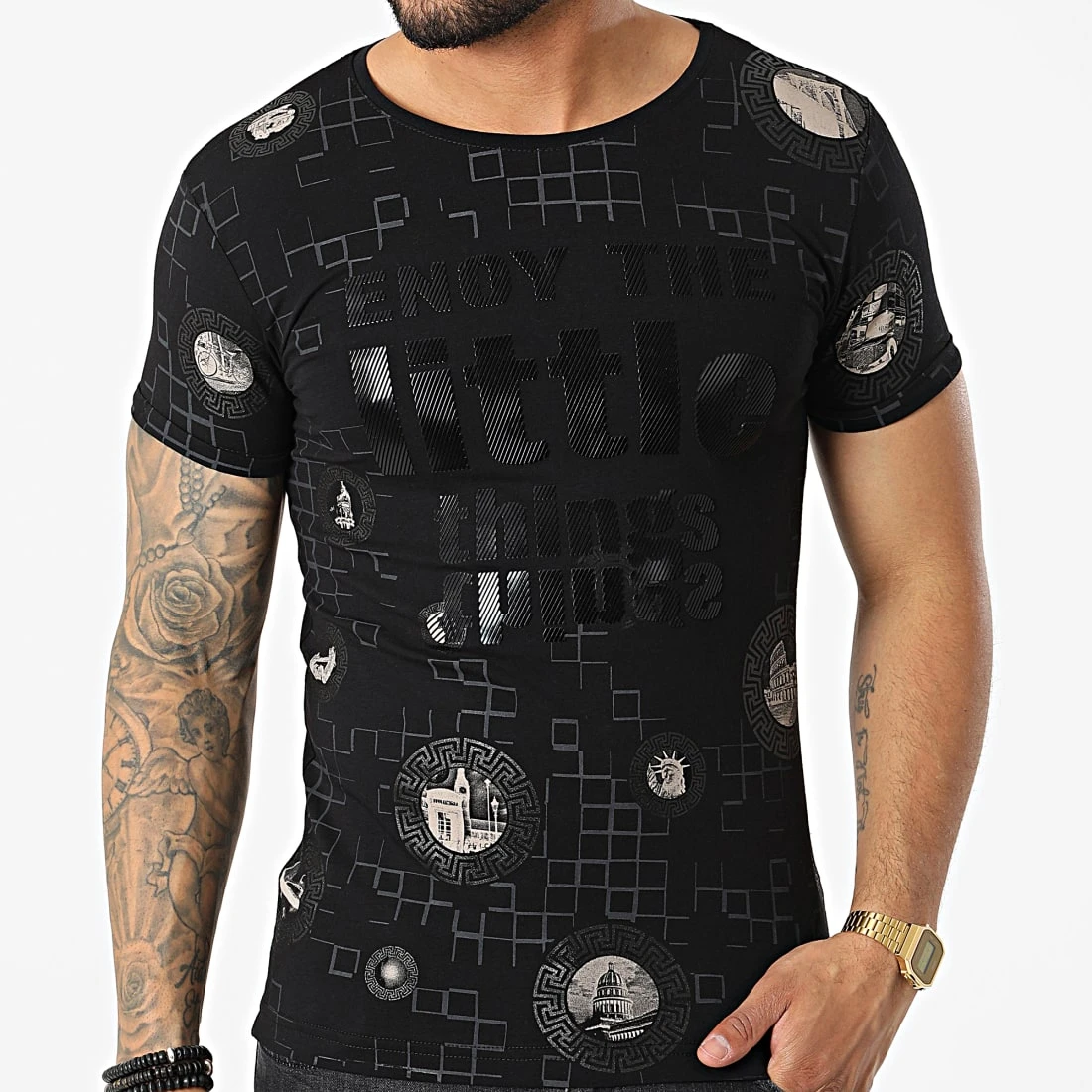 • Tee shirt en coton stretch imprimé et appliqué visuel en relief
