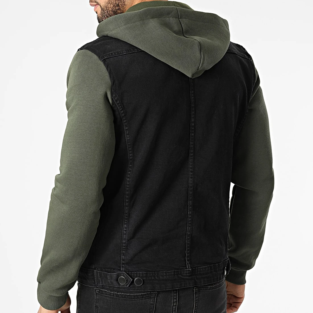 • Veste jean capuche bi-matière avec finition usée et tachée